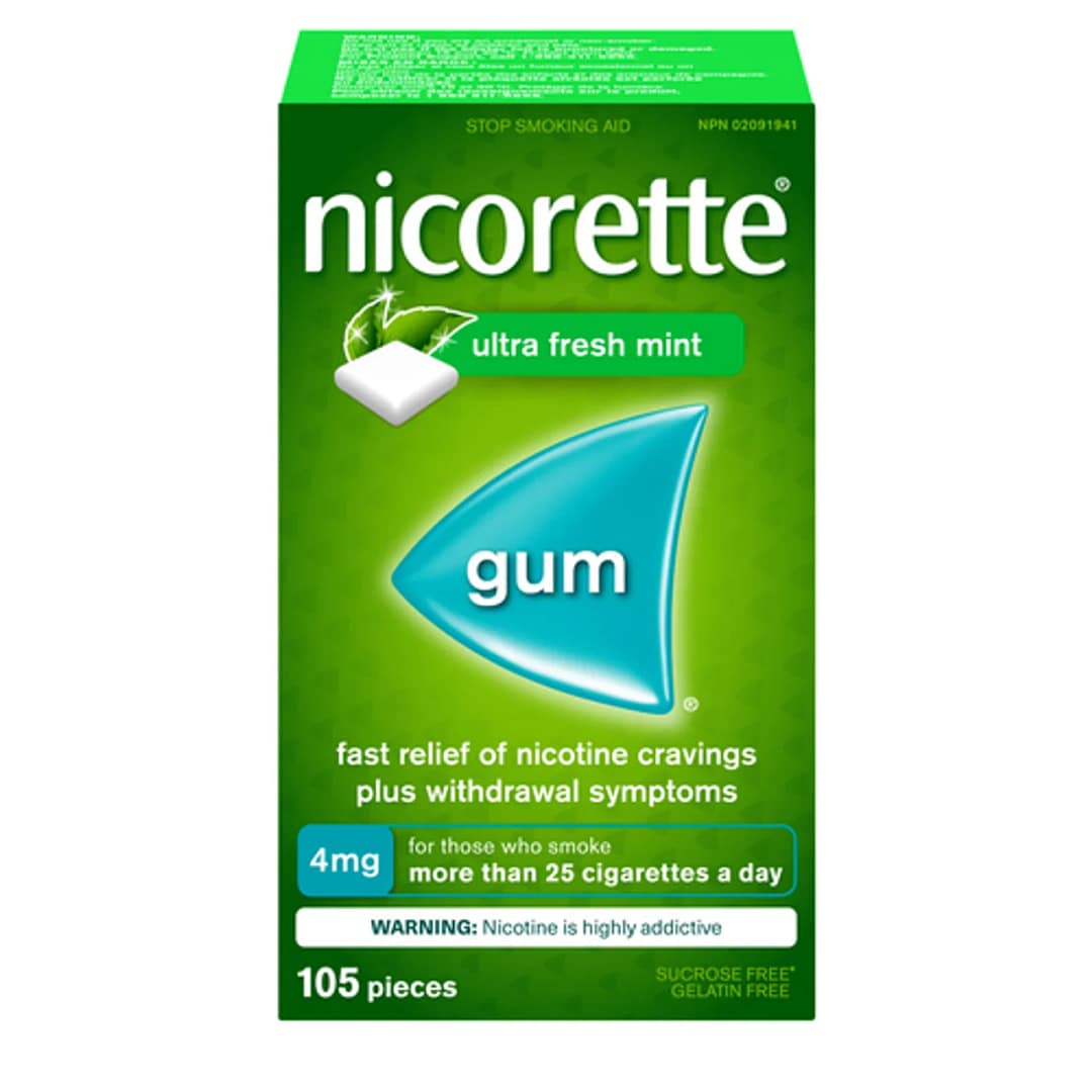 Nicorette Ultra Fresh Mint works fast to relieve your nicotine cravings and withdrawal symptoms. For adults who smoke more than 25 cigarettes a day, this gum contains 4mg nicotine and comes with 105 pieces per pack. Feel confident in your journey to quit with this nicotine replacement therapy (NRT) and smoking cessation aid. Nicorette Gum is designed to combat the powerful cravings that often accompany quitting smoking, making the transition to a smoke-free life smoother. It is a steadfast companion in reducing the discomfort of nicotine withdrawal symptoms, increasing your chances of successfully quitting when compared to relying on sheer willpower alone. Using Nicorette Gum correctly can make a difference, doubling your likelihood of achieving your smoke-free goals. Whenever the urge to smoke strikes, simply chew a piece of this gum, and feel the cravings dissipate. You can chew up to 20 pieces a day, allowing you to adapt your usage to your unique needs and cravings. Whether you aim to quit smoking all at once or prefer a gradual approach by progressively reducing the number of cigarettes you smoke each day, Nicorette Gum provides a versatile solution to fit your quitting strategy. This pack comes with 105 pieces of gum.