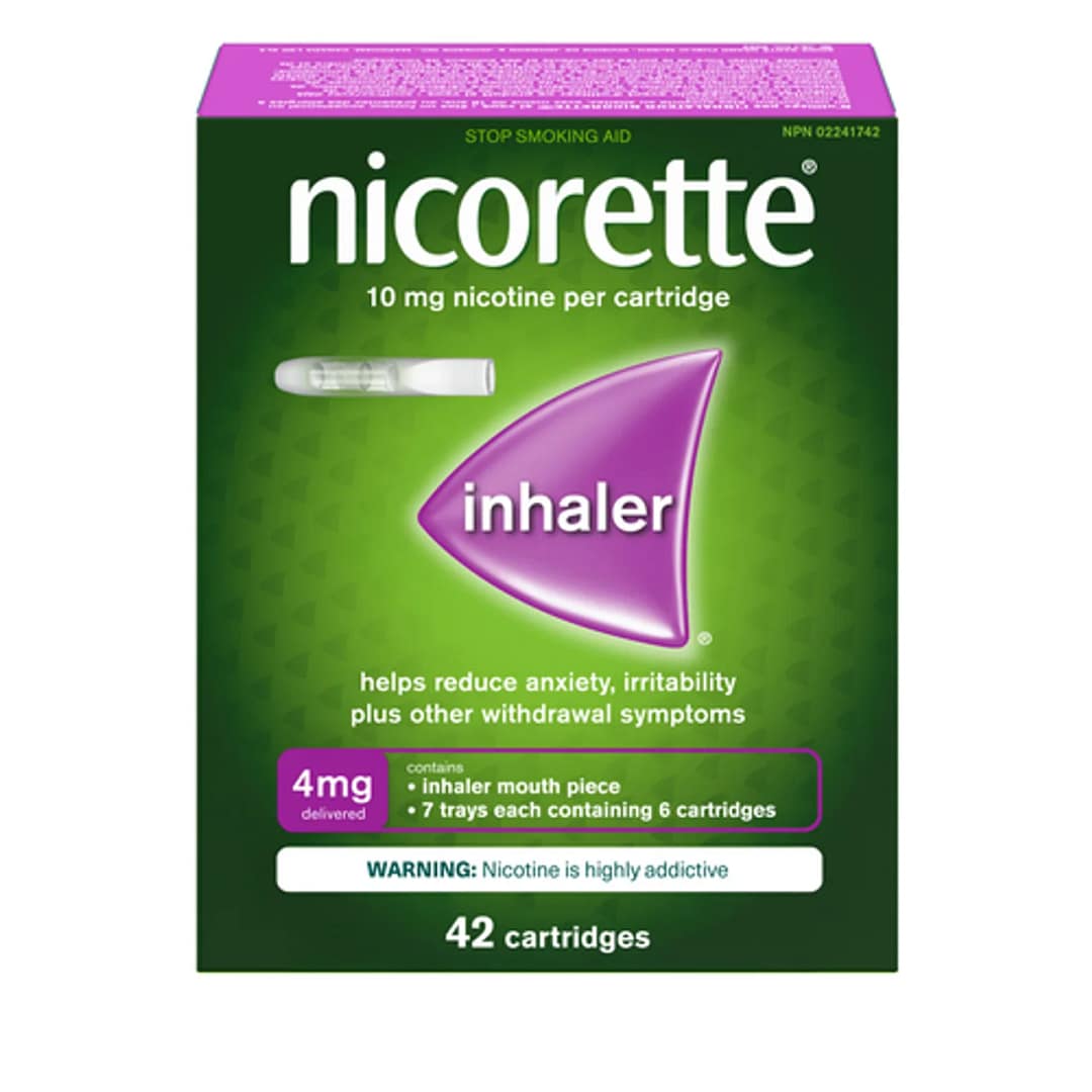 Nicorette Inhaler Refills delivers 4 milligrams of nicotine that lasts about 20 minutes of frequent puffing. Nicorette may help you stop smoking by alleviating the discomfort of cravings and withdrawal symptoms. The Nicorette Inhaler stands as a pioneering solution, representing a nicotine replacement therapy (NRT) inhaler containing nicotine that has been clinically validated to aid in your journey to quit smoking. With every inhaler refill, you receive a steady delivery of nicotine, a powerful ally in combatting the relentless cravings and unpleasant withdrawal symptoms that often accompany quitting smoking. This innovative device consists of two integral components: a mouthpiece and a replaceable nicotine cartridge. You can rely on the inhaler up to 12 times a day, as needed, and it will administer the necessary nicotine to help satisfy your urge to smoke. Not only does this smoking cessation aid address your physiological needs, but it also keeps your hands engaged, similar to holding a cigarette. This tactile aspect is a significant psychological advantage, as it provides a familiar and comforting sensation. Trust in the Nicorette Inhaler to reinforce your commitment to quitting. This product comes with 42 refill cartridges.